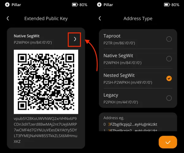 Nested Segwit 또는 Legacy의 xPub를 내보내야 하는 경우 모드를 정확히 변경하면 표시됩니다.