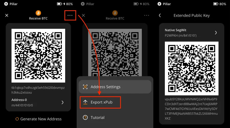 오른쪽 상단 모서리에 있는 […] 를 탭하고 [xPub 내보내기] 를 찾으세요 . Native Segwit의 xPub가 포함된 QR 코드가 표시됩니다.