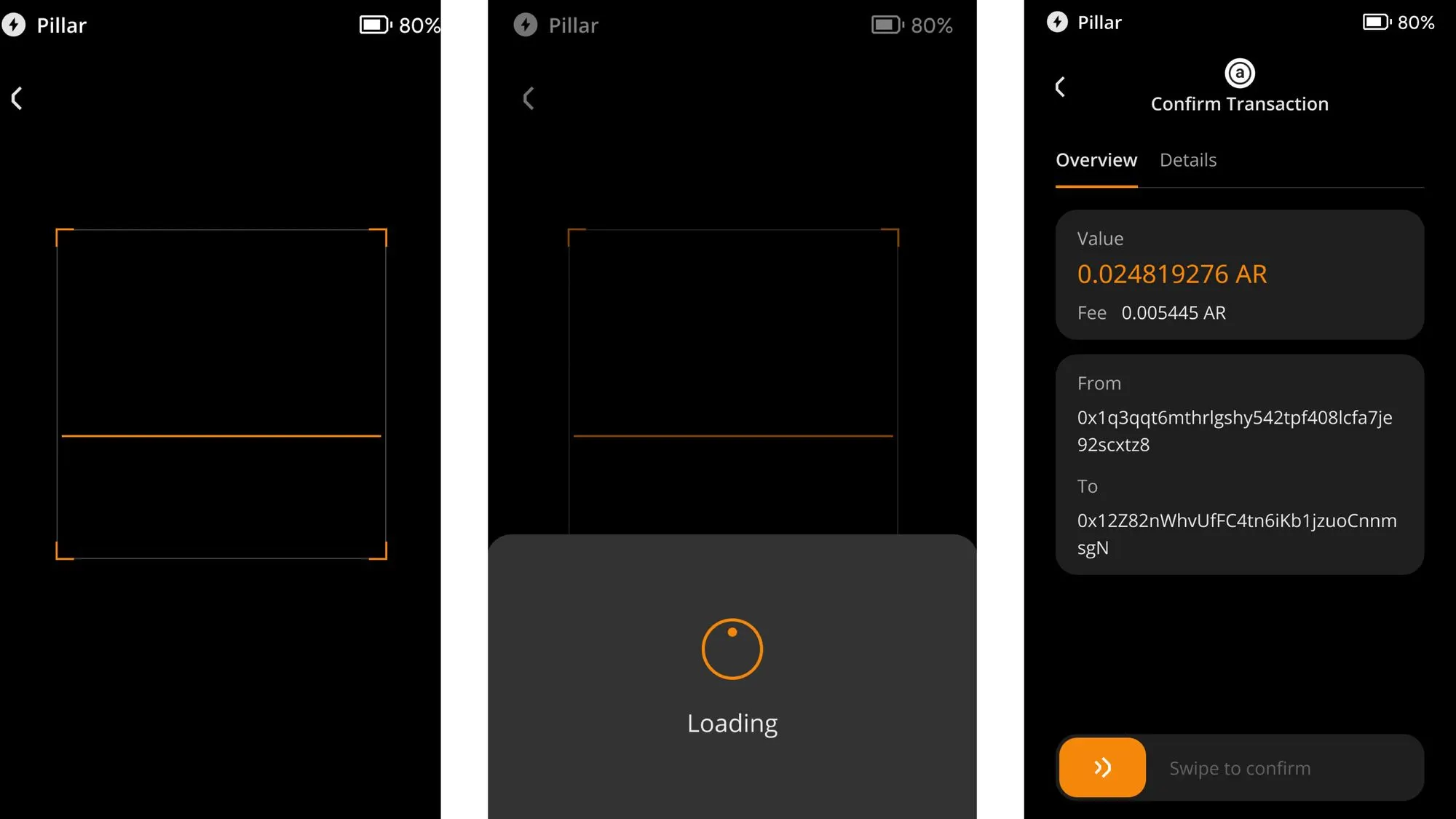 ArConnect Extension에서 서명 요청 시 표시되는 QR 코드를 스캔 > 거래 정보 확인 > [스와이프하여 확인] > Keystone Hardware Wallet에서 다시 QR 코드가 표시됩니다.