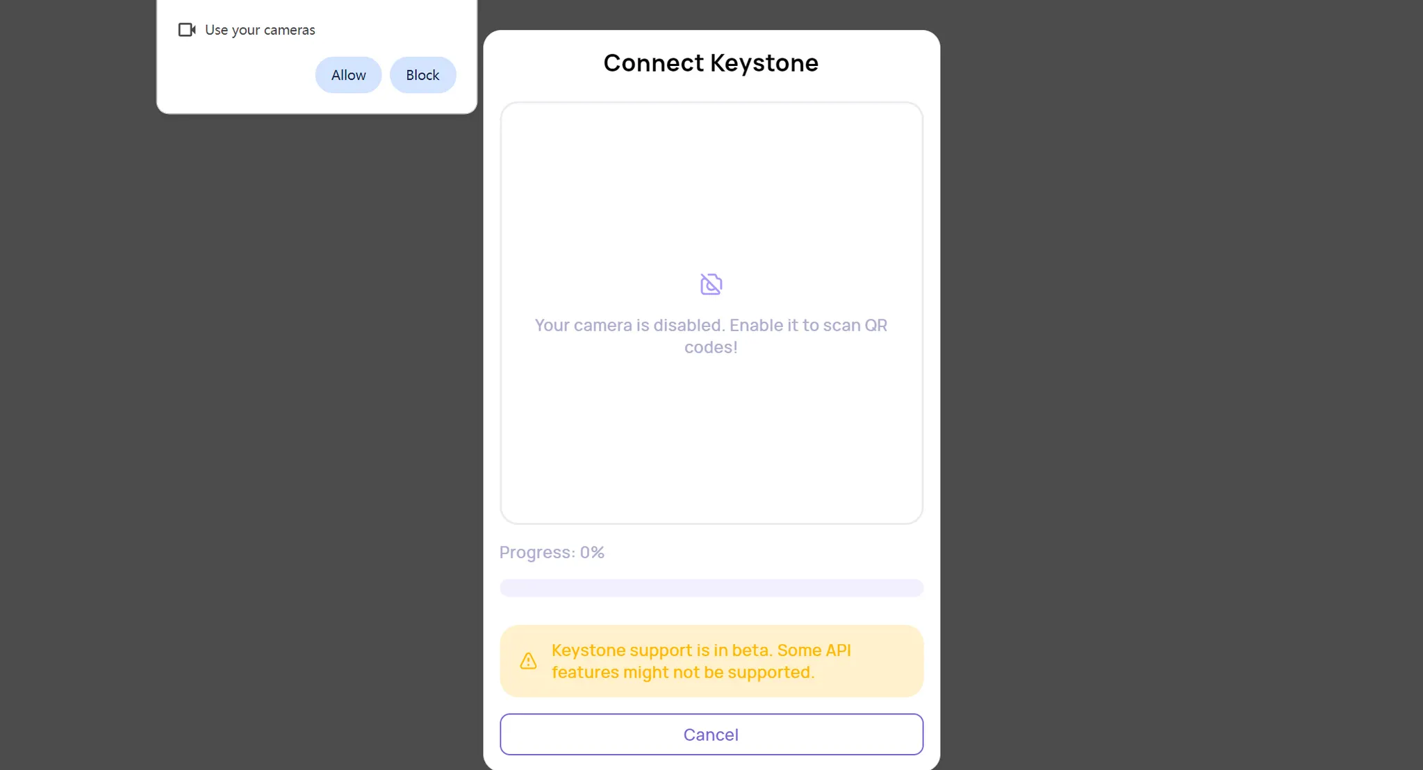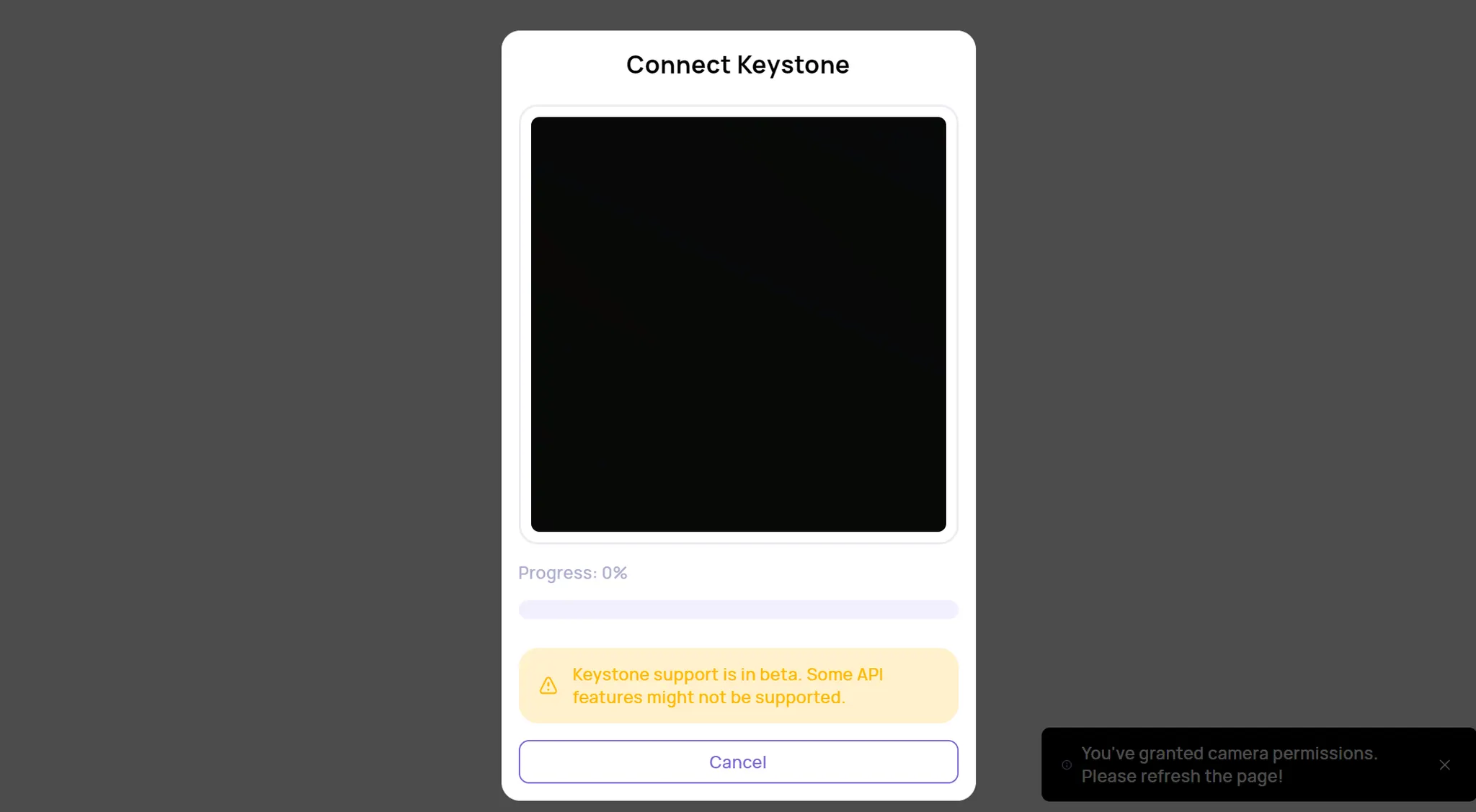 ArConnect Extension은 서명을 얻기 위한 스캔 페이지를 표시합니다. 컴퓨터의 웹캠을 사용하여 Keystone 장치에 표시된 서명 QR 코드를 스캔합니다.