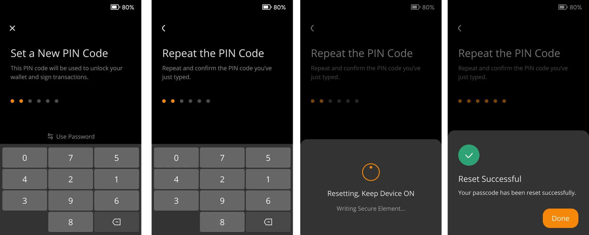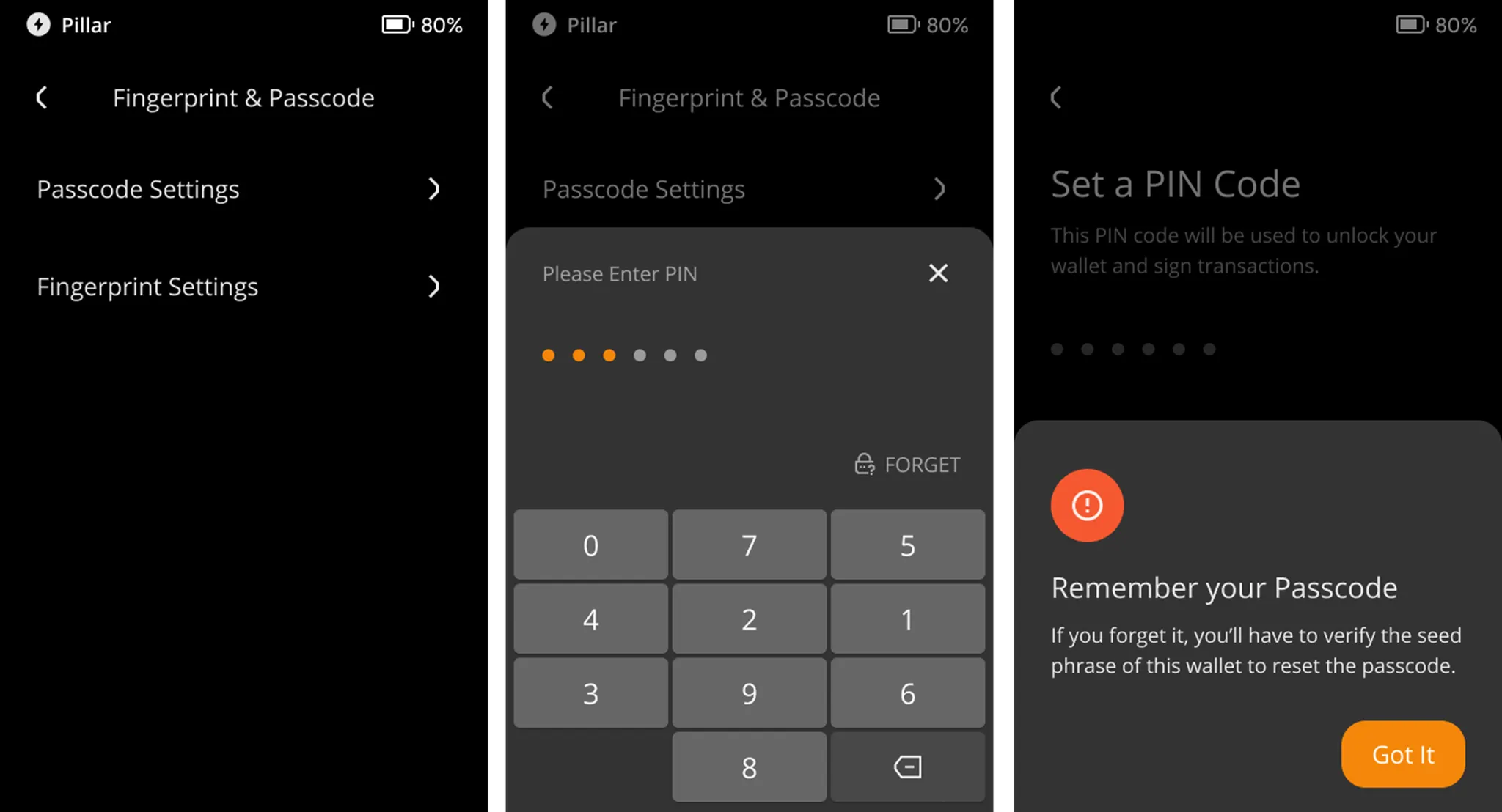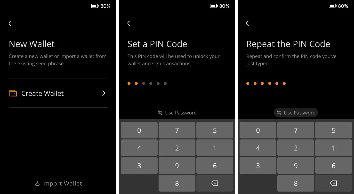 초기 설정 단계에서는 '지갑 생성'을 클릭한 후 지갑을 보호하기 위한 강력한 PIN 코드 또는 비밀번호를 선택할 수 있습니다.