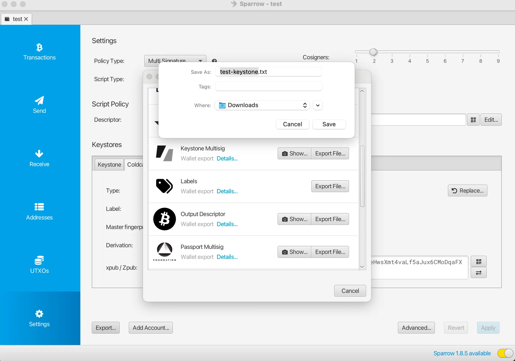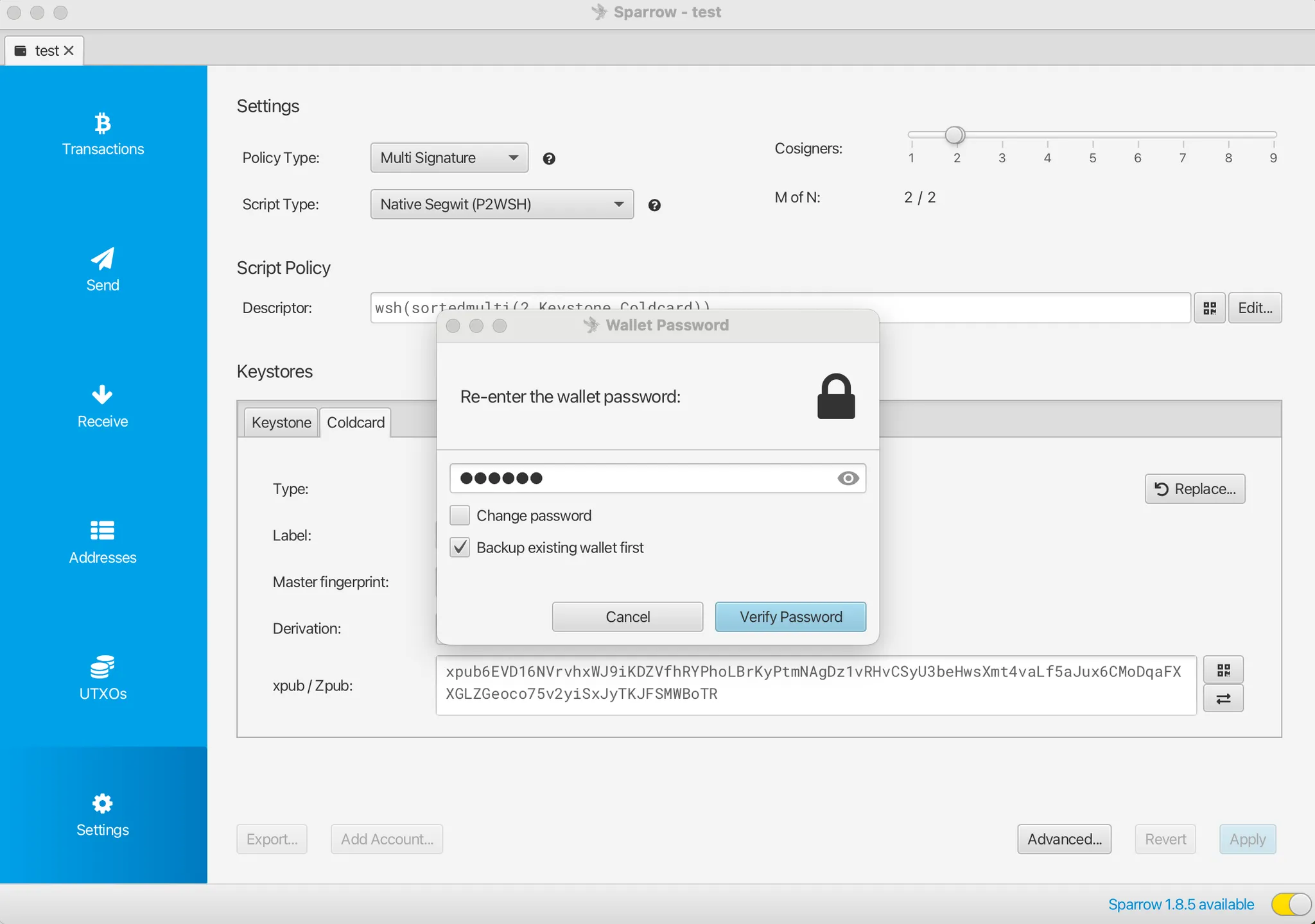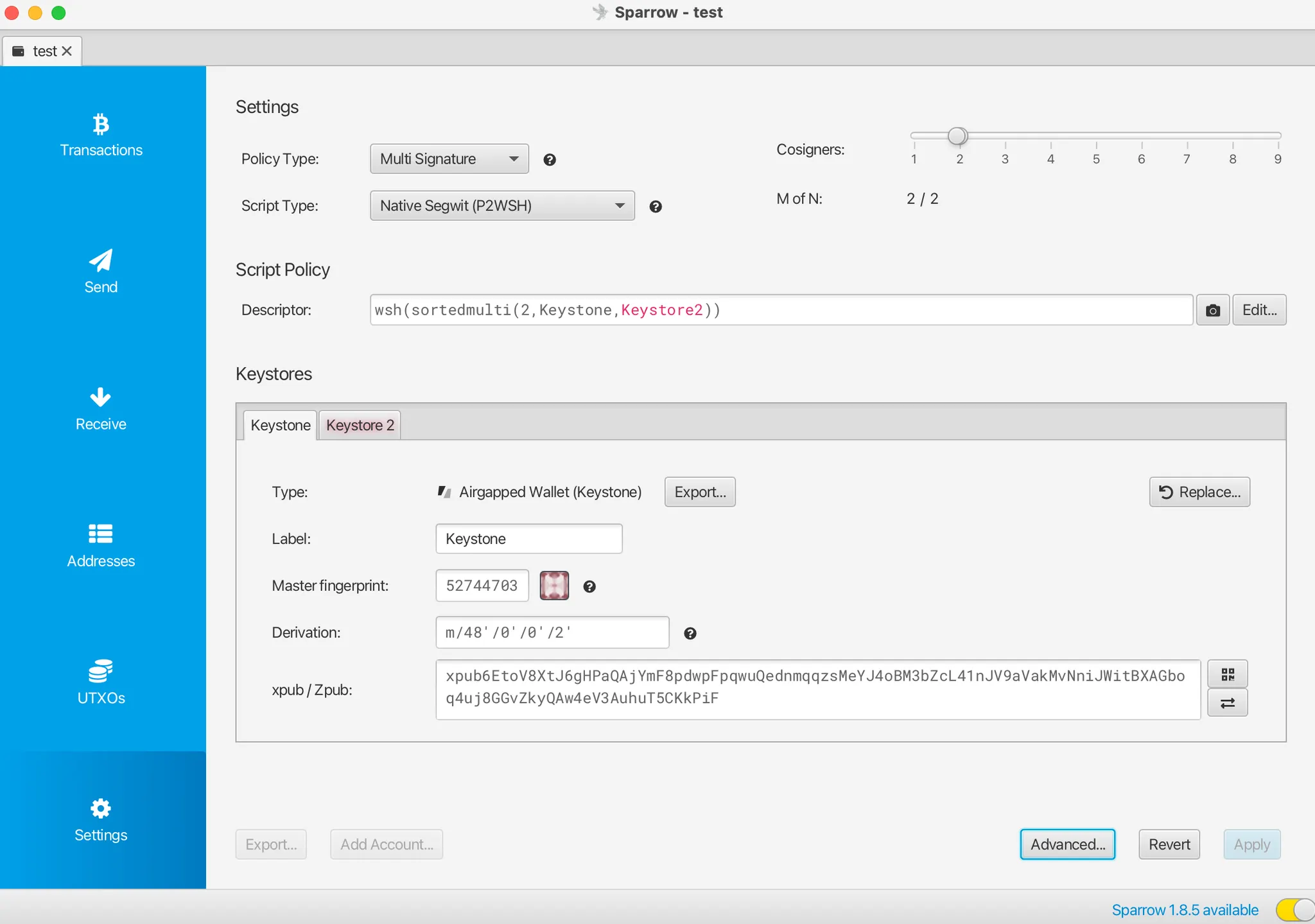 3. Sparrow에서 Keystone 및 ColdCard를 서명자로 하여 2/2 다중 서명 지갑을 만듭니다 .