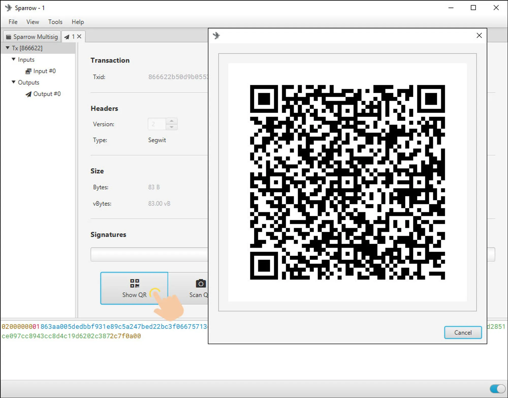 【QR 표시】를 클릭하면 Sparrow Wallet에 서명되지 않은 거래 데이터의 QR 코드 형식이 표시됩니다.