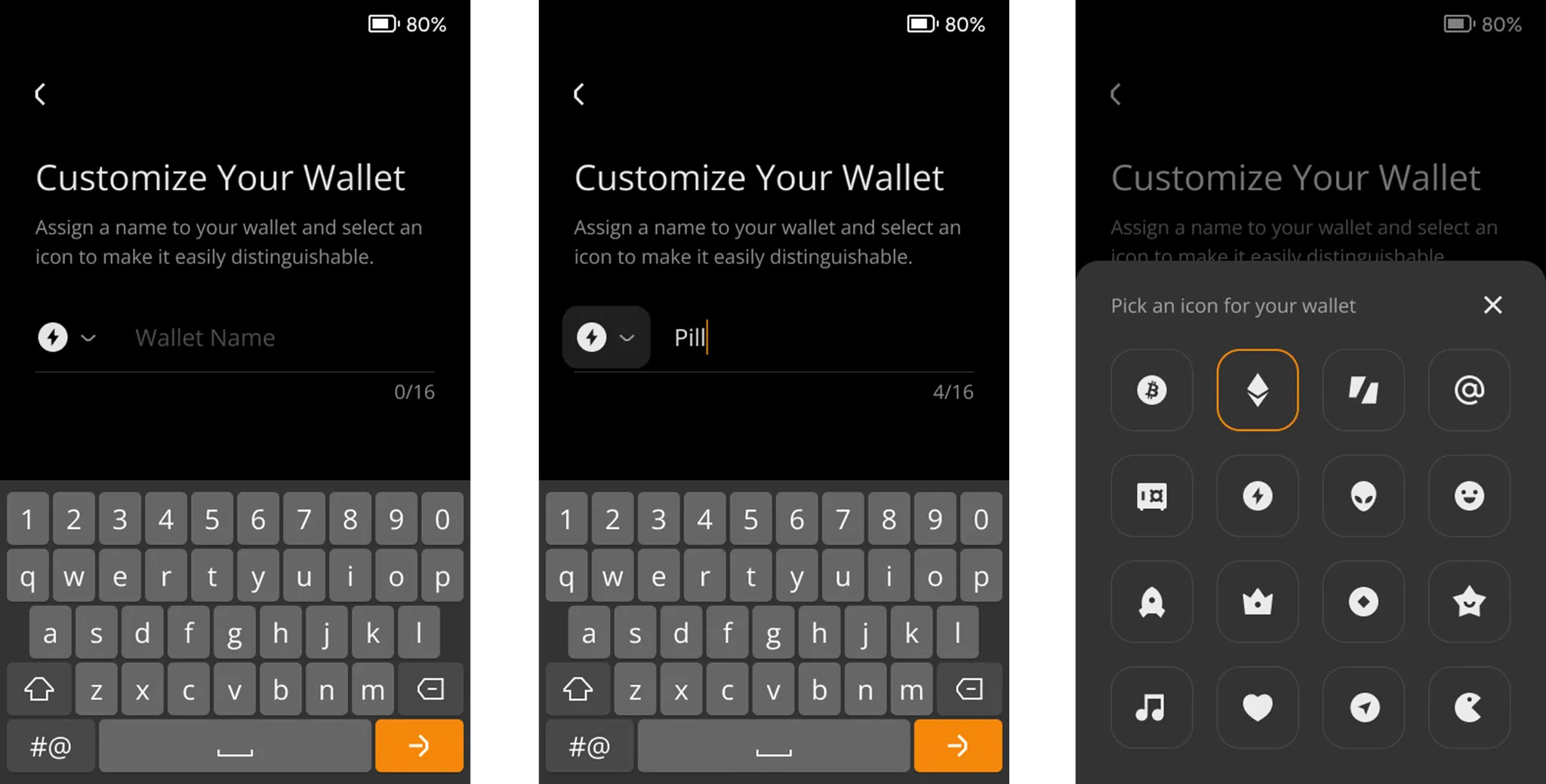 연필 아이콘을 클릭하여 이름을 지정하고 아이콘을 선택하여 지갑을 사용자 지정하세요. (이름에 개인 메시지를 포함하지 마세요.)