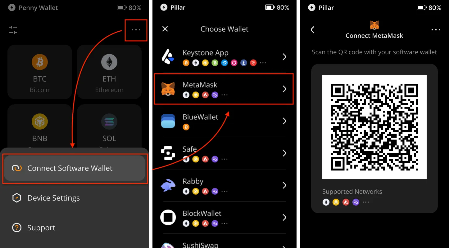 Keystone 하드웨어 지갑에서 메뉴에서 [MetaMask]를 선택하여 QR 코드를 표시합니다.