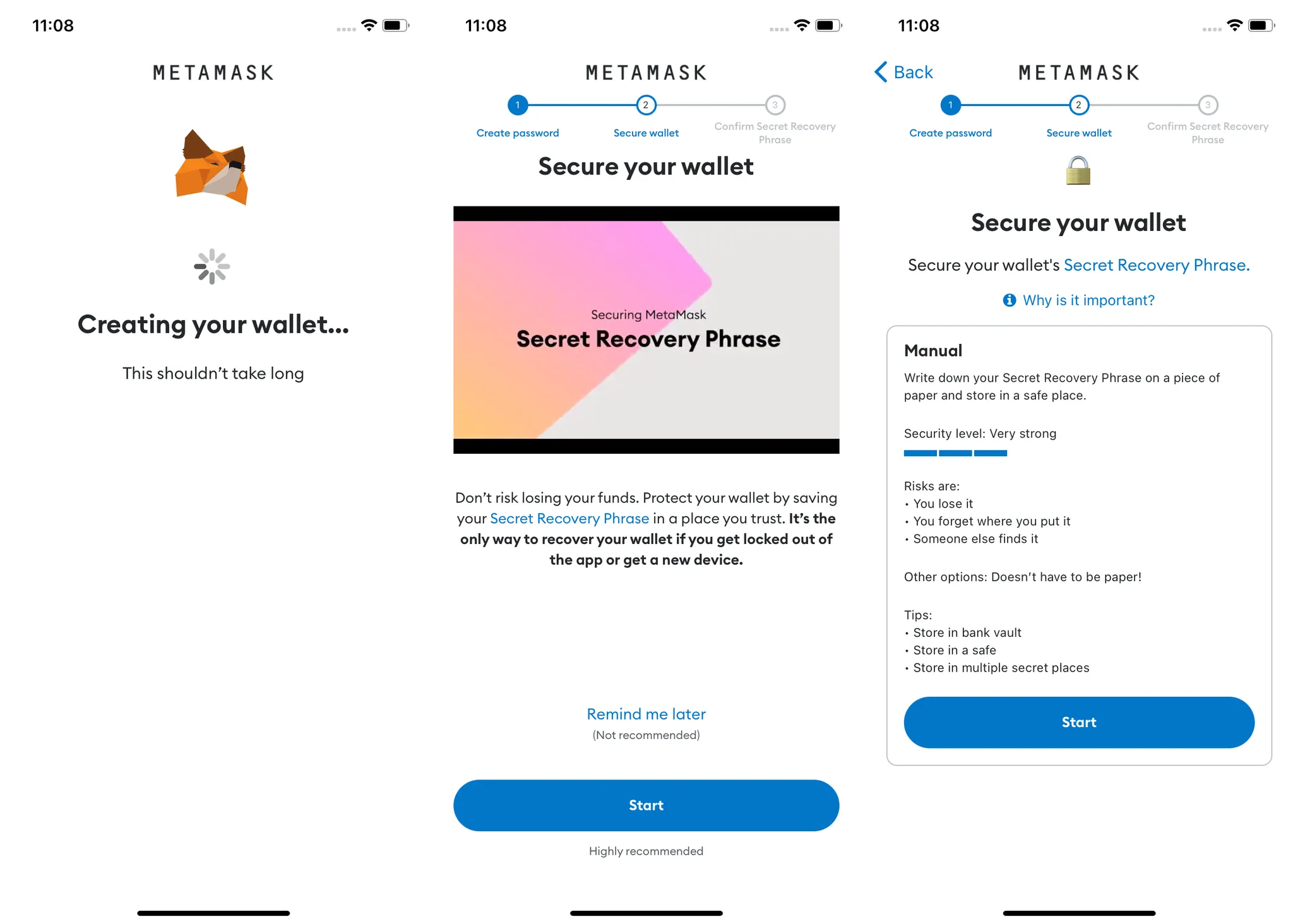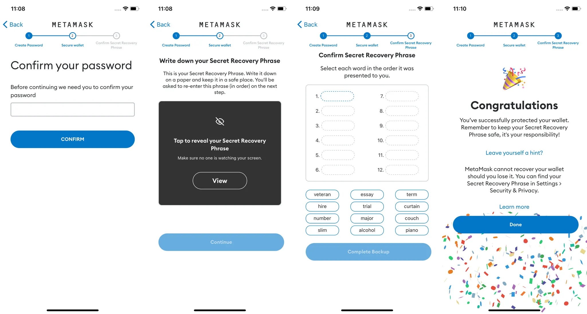 더미 지갑의 비밀번호와 비밀 복구 문구를 확인하세요. [계속] 을 탭하여 비밀 복구 문구를 다시 확인한 다음 [백업 완료] 를 탭하여 설정을 완료하세요.