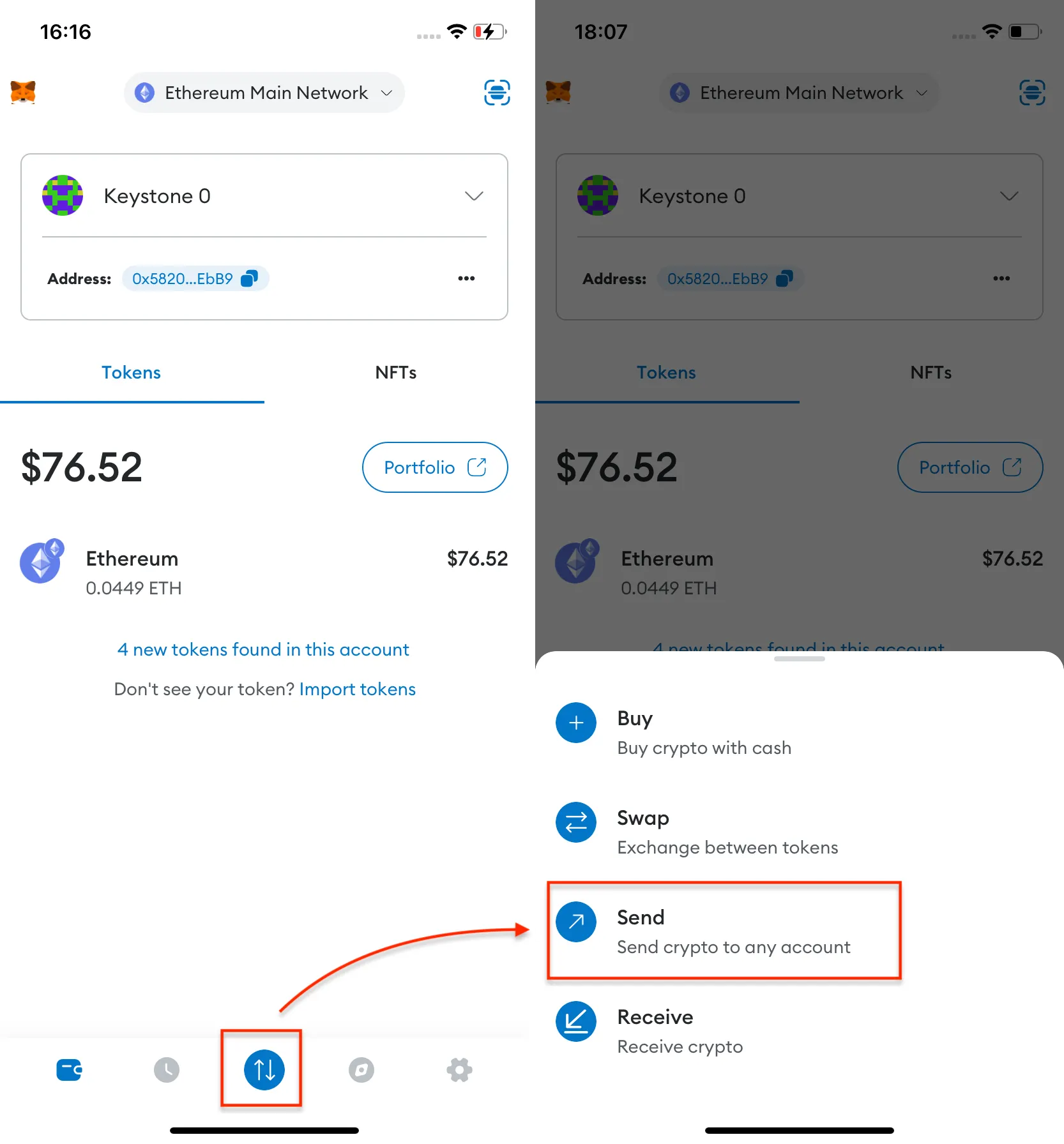 Keystone에 연결된 MetaMask를 통해 ETH 보내기