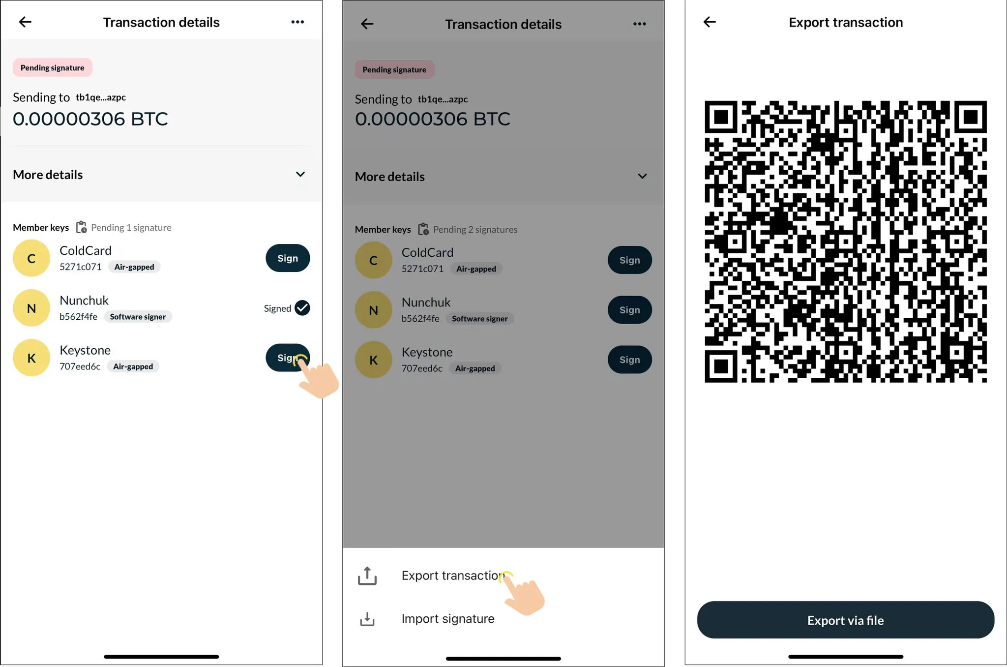 "Keystone" 옆에 있는 "서명" 버튼을 클릭한 다음 "거래 내보내기"를 클릭하면 Nunchuk이 부분적으로 서명된 거래를 동적 QR 코드로 표시합니다.