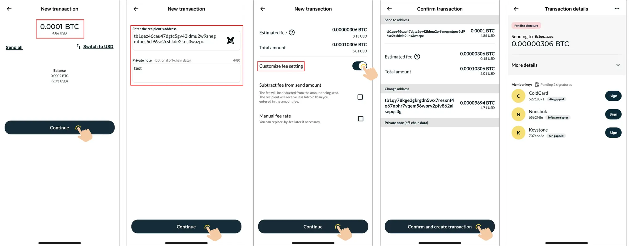 거래 금액을 설정하려면 "계속"을 클릭한 다음 수신 주소와 선택 사항인 메모를 설정하고 "계속"을 다시 클릭합니다. 필요한 경우 거래 수수료를 사용자 지정하고 "계속"을 클릭합니다. 거래 세부 정보를 확인한 후 "확인 및 거래 생성"을 클릭하여 서명 페이지로 진행합니다.