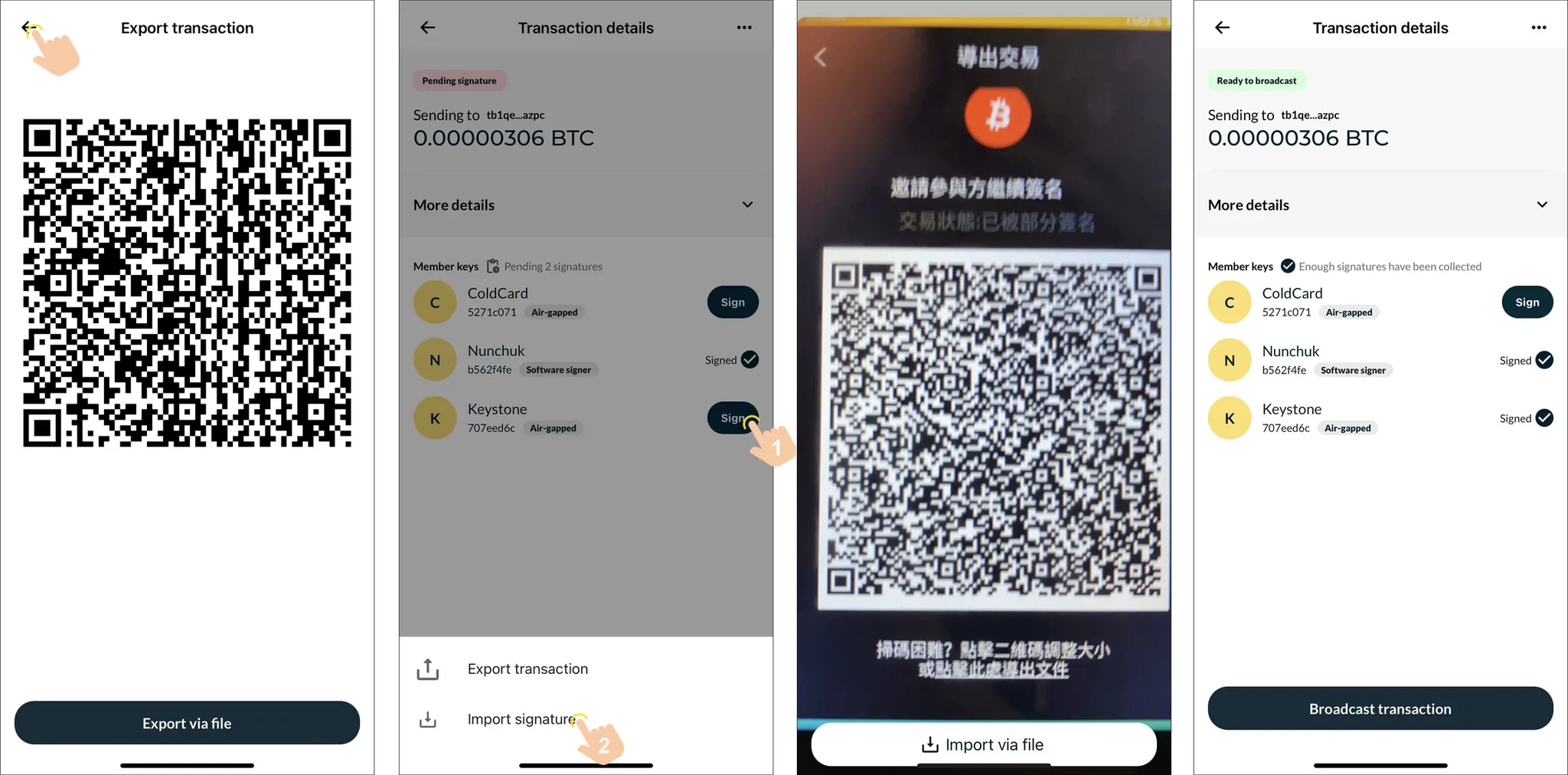 Nunchuk에서 화면 오른쪽 상단의 "←" 버튼을 탭한 다음 "서명 가져오기"를 탭하고 Keystone에서 표시된 동적 서명 거래 QR 코드를 스캔합니다. 스캔한 후 두 번째 다중 서명 당사자가 서명을 완료합니다.