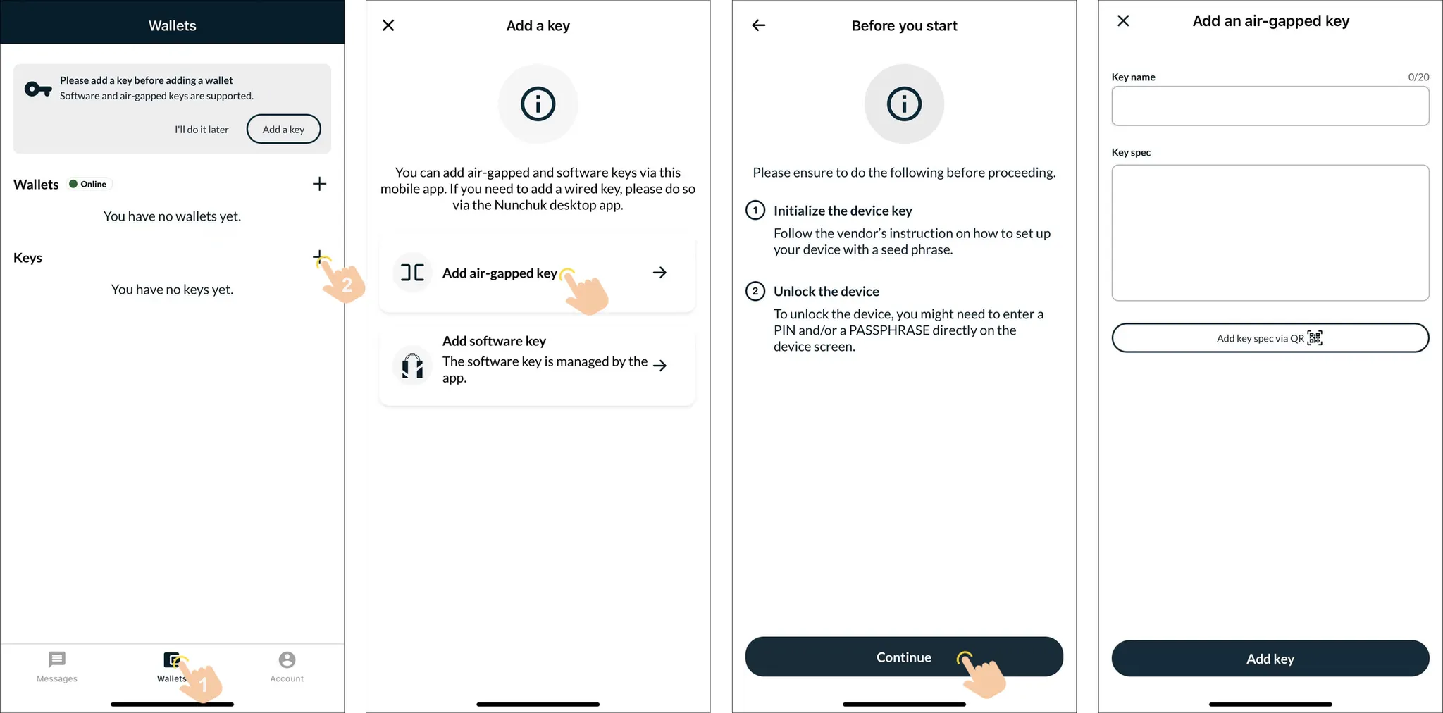 '키 추가'를 클릭한 다음 '+'를 클릭하고 '에어갭 키 추가'를 선택하고 계속합니다.