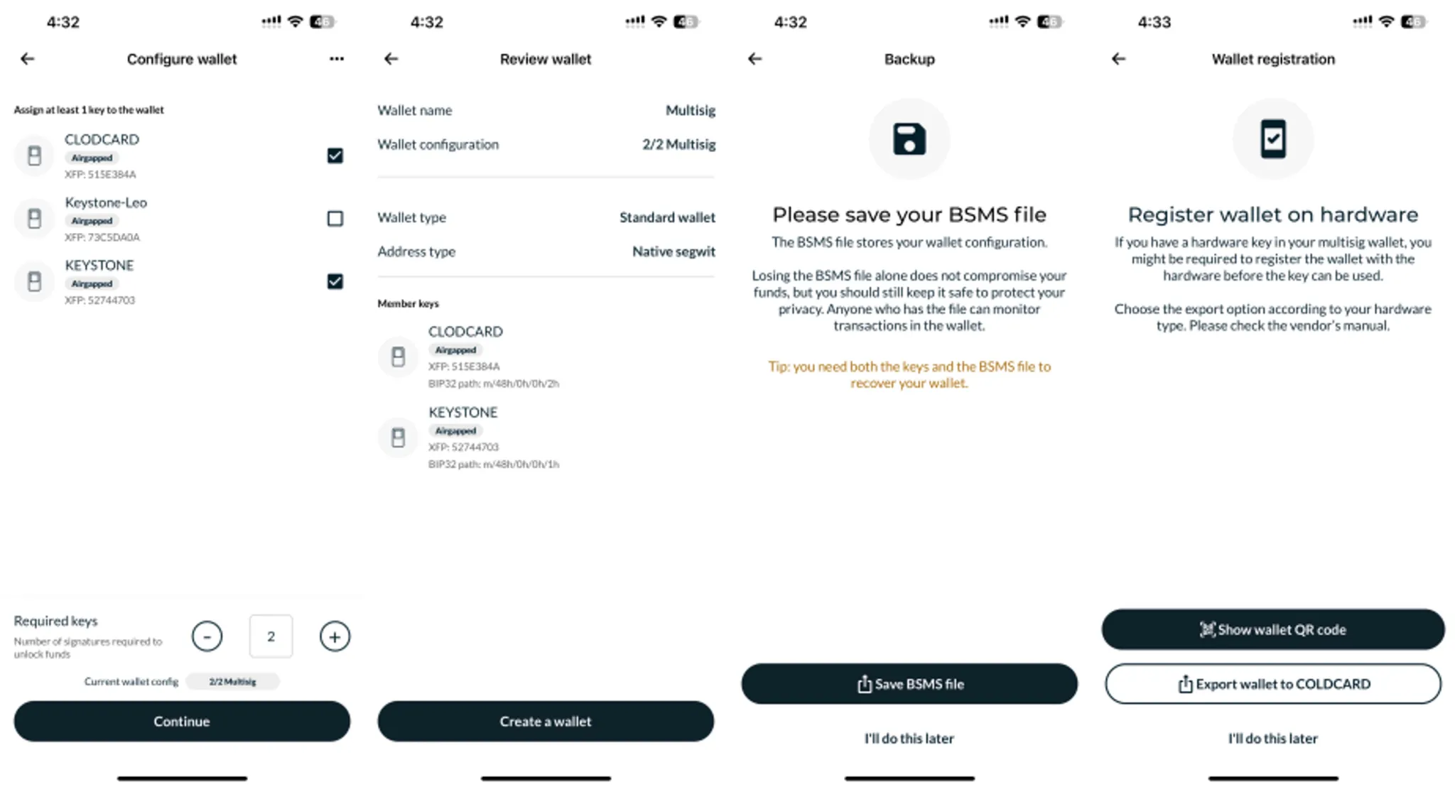멀티시그에 참여할 두 개의 키를 선택하고 원하는 서명 수를 설정합니다. BSMS 파일을 저장하고 나중에 할게요를 선택하고 다음 단계에서 멀티시그니처 지갑을 Keystone 지갑 장치로 가져옵니다.