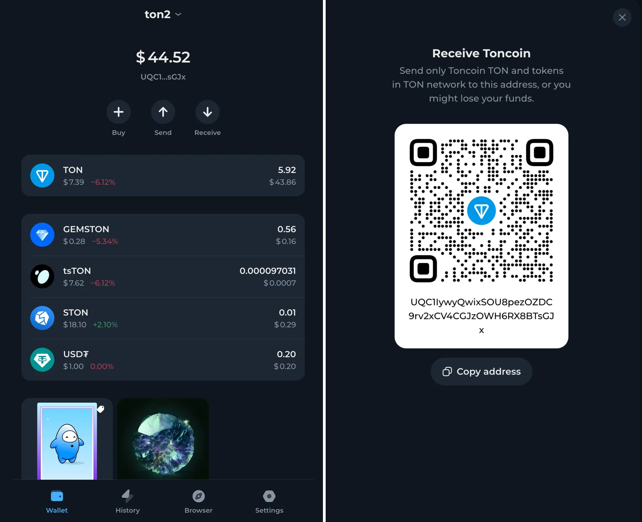 Tonkeeper에서 "수신" 버튼을 클릭합니다(보안을 위해 Keystone 하드웨어를 통해 수신하거나 주소를 비교하는 것이 좋습니다).