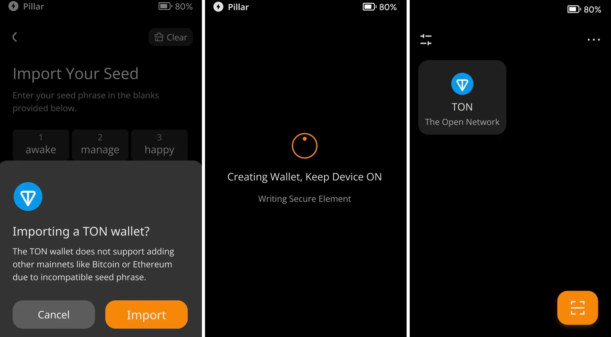 오른쪽 상단 모서리에 있는 "..."을 선택하고 TON 니모닉(Tonkeeper 또는 MyTonWallet에서 생성)을 입력하고 10분 정도 기다린 후 기기 전원이 최소 60% 이상이고 USB 충전에 연결되어 있는지 확인하세요.
