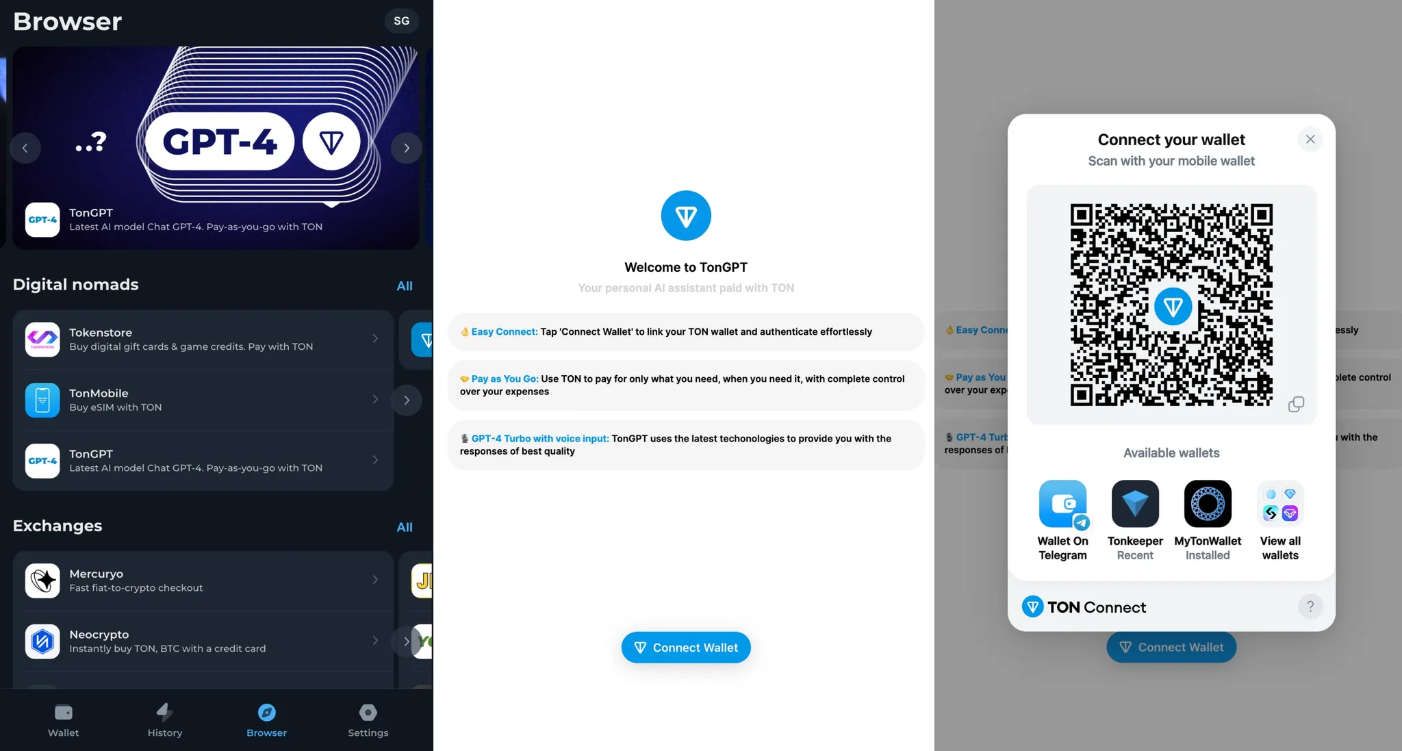 "Tonkeeper"를 선택하면 지갑을 연결하기 위한 QR 코드가 표시됩니다.