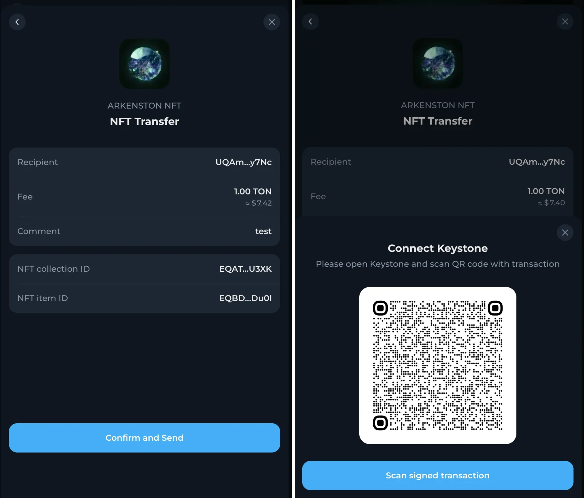 키스톤 장치를 사용하여 거래를 스캔하고 확인한 다음, 톤키퍼를 사용하여 서명된 QR 코드를 스캔하여 완료하세요.