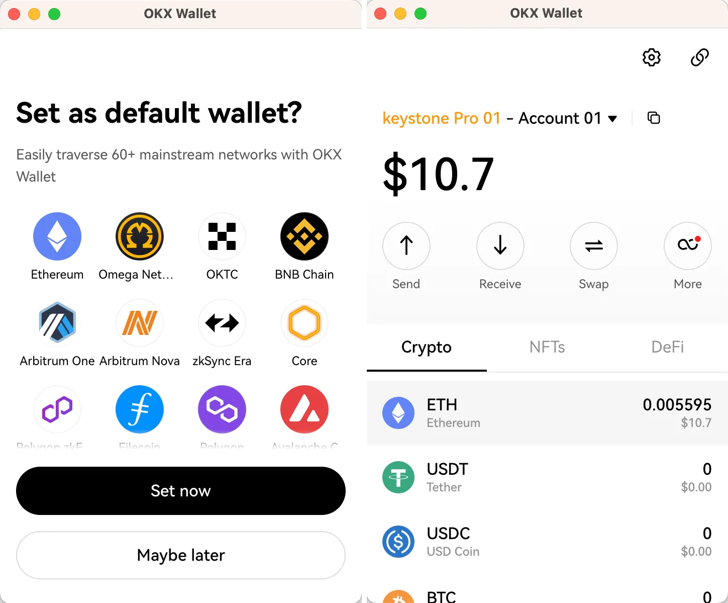 축하합니다! EVM 체인의 Keystone 계정을 OKX Wallet과 원활하게 연결했습니다. 이제 안전하게 기능을 탐색할 준비가 되었습니다.