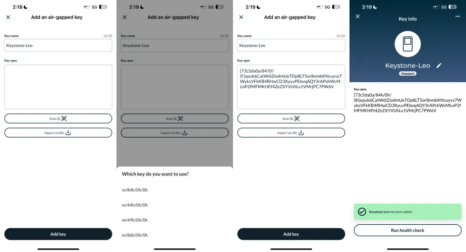 "QR 스캔" 버튼을 탭하고 스마트폰 카메라를 사용하여 Keystone 기기에 표시된 QR 코드를 스캔한 다음, 비트코인 주소에 대한 경로를 선택하세요.