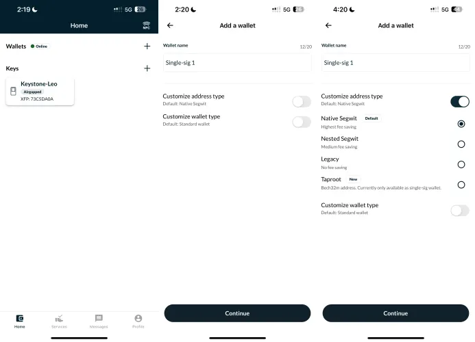 "주소 유형 사용자 지정"을 열고 비트코인 주소에 대한 경로를 선택한 다음 "계속" 버튼을 클릭합니다.