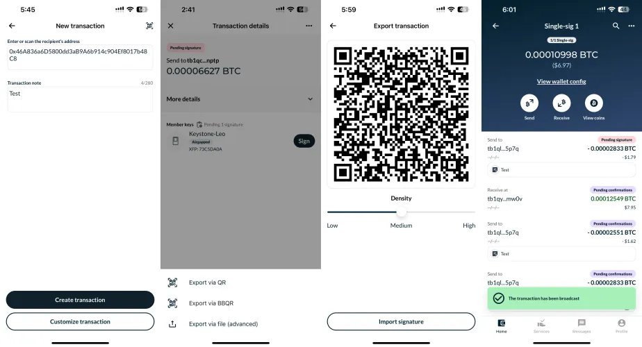"거래 내보내기"를 선택한 다음 "QR로 내보내기"를 선택하고, Keystone 장치로 QR 코드를 스캔하여 서명하기 전에 거래 세부 정보가 올바른지 확인하세요.