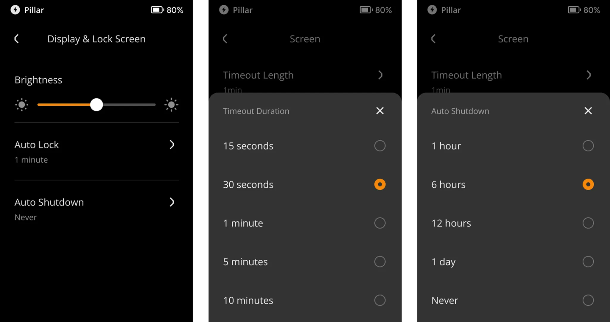 화면 밝기, 자동 잠금 시간, 자동 종료 시간을 편리하게 조정하여 기기의 디스플레이 설정을 사용자의 선호도에 맞게 조정할 수 있습니다.