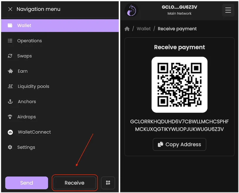 xBull에서 [수신] 버튼을 클릭합니다. (보안상의 이유로 Keystone 하드웨어 지갑을 통해 자금을 수신하거나 주소를 확인하는 것이 좋습니다.)