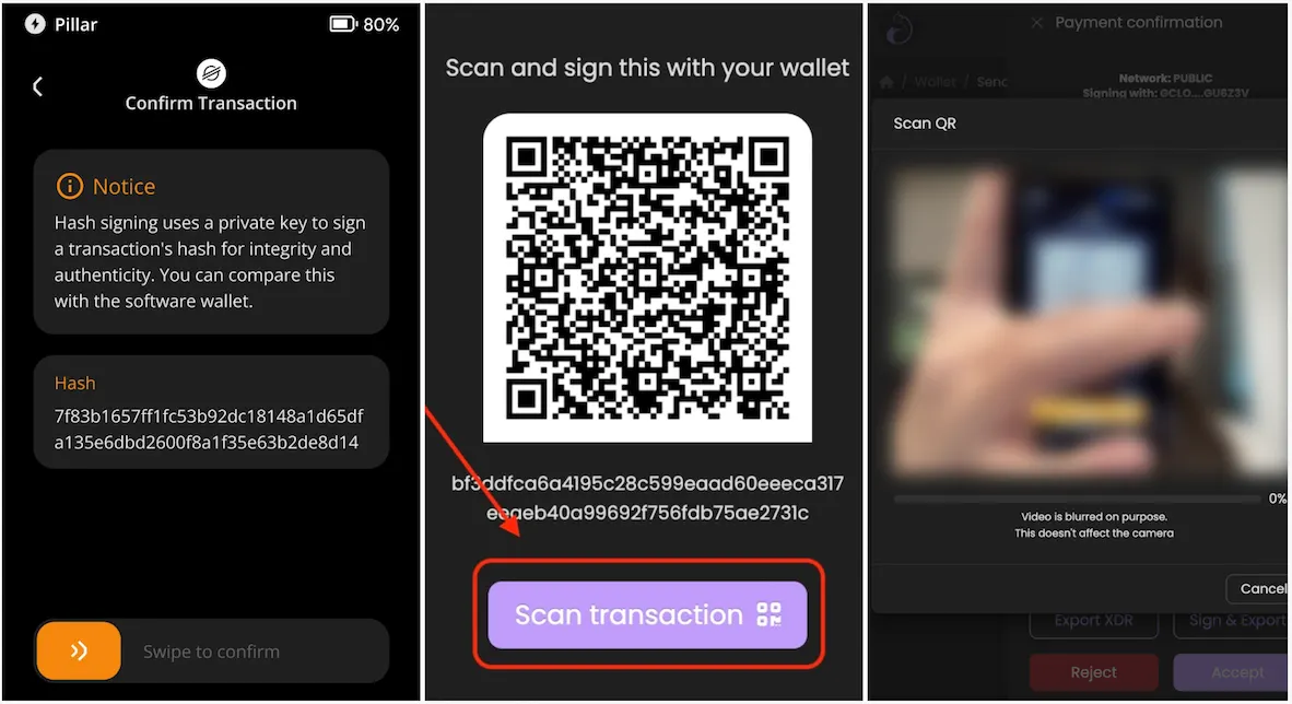 키스톤으로 스캔한 후 거래 알림과 해시가 표시됩니다. 모든 것이 올바른지 비교하고 확인한 후 슬라이더를 끌어 서명합니다.