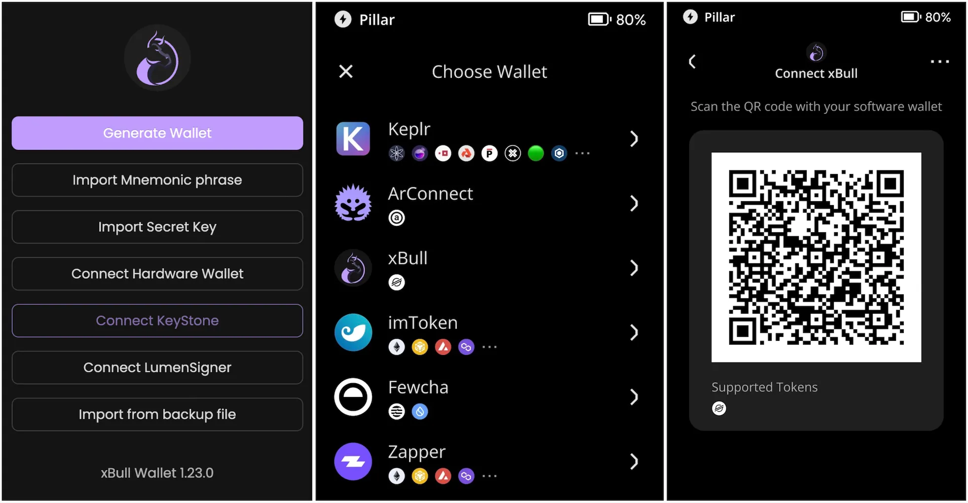 Keystone 하드웨어 지갑 사용자는 Keystone 지갑을 xBull과 같은 소프트웨어 지갑에 연결하여 Stellar Lumens(XLM)와 같은 자산을 보내고 받고 교환하는 등 Stellar 네트워크의 다양한 기능에 액세스할 수 있습니다.