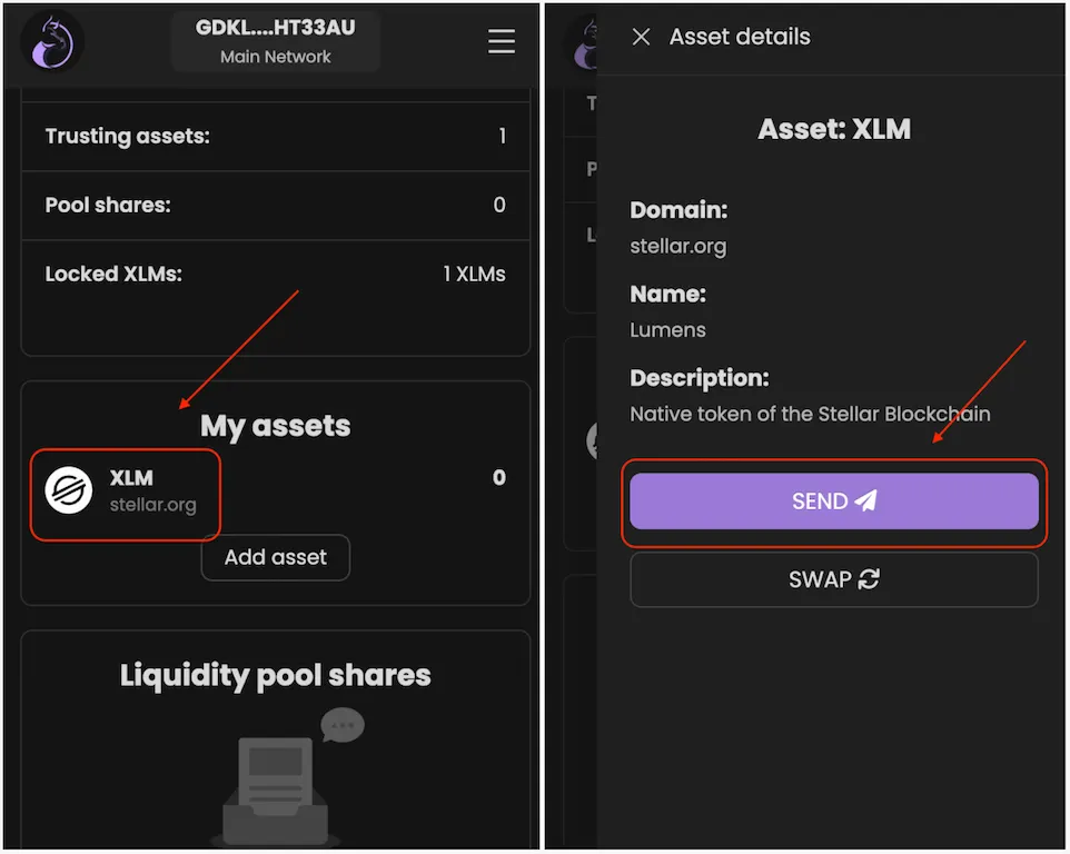 “내 자산”에서 XLM을 클릭하여 “자산 세부 정보” 페이지로 이동한 다음 [보내기]를 클릭합니다 .