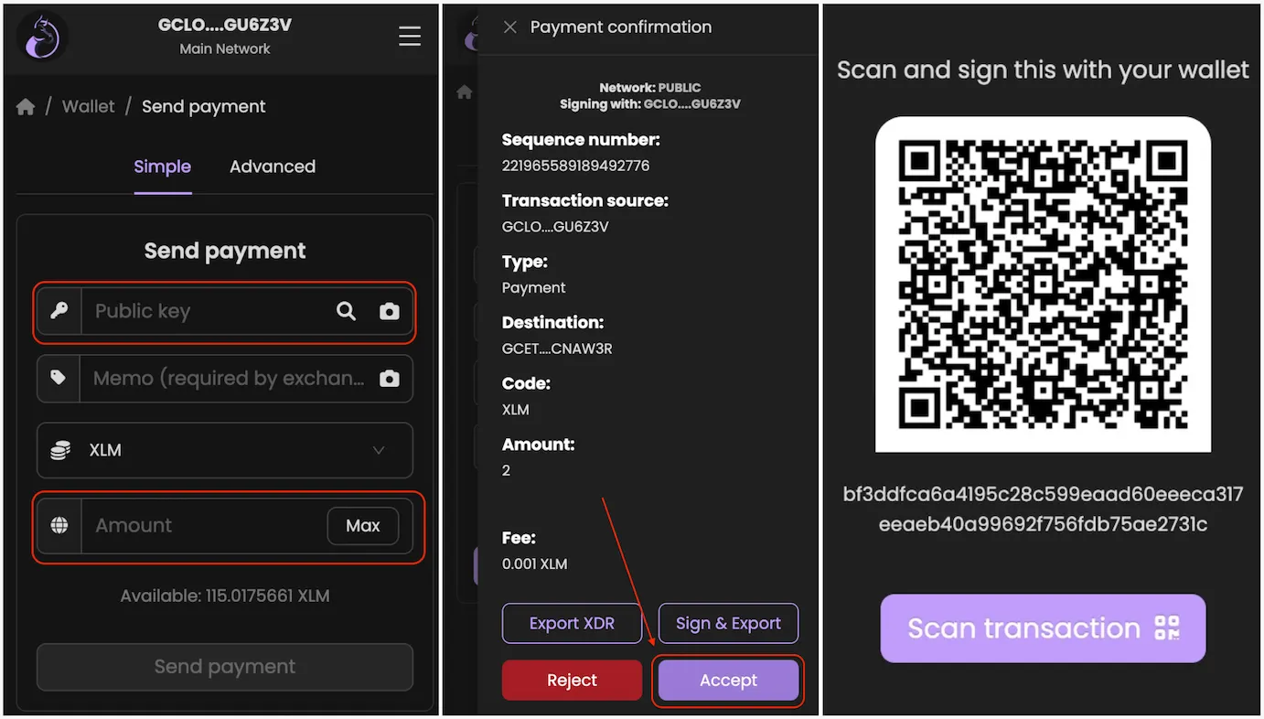 “결제 보내기” 페이지에서 초기 결제 주소와 금액을 입력한 후 하단의 [결제 보내기] 버튼을 클릭하여 거래 확인 페이지로 이동합니다. 모든 것이 정확한지 확인한 후 [수락]을 클릭합니다 .