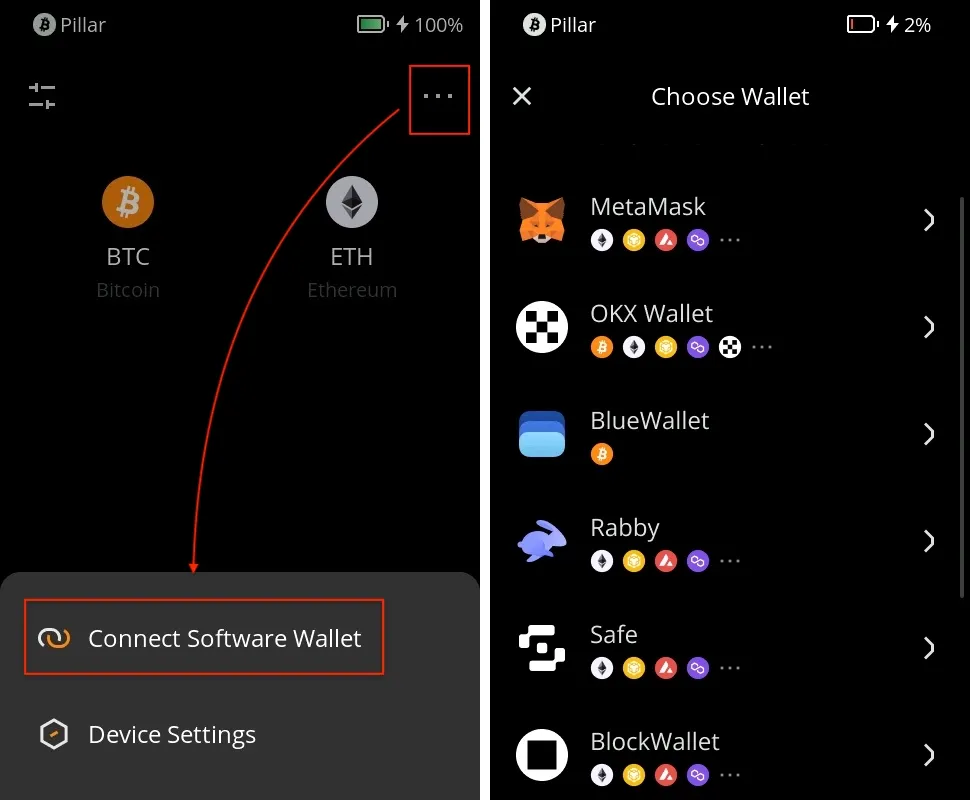 Keystone 기기에서 "Connect Software Wallet"을 찾아 탭합니다. 이전에 다운로드한 소프트웨어 지갑을 선택합니다.