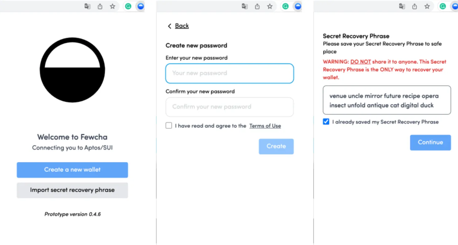Fewcha 지갑에 대한 비밀번호를 설정하고 [생성]을 클릭하세요.