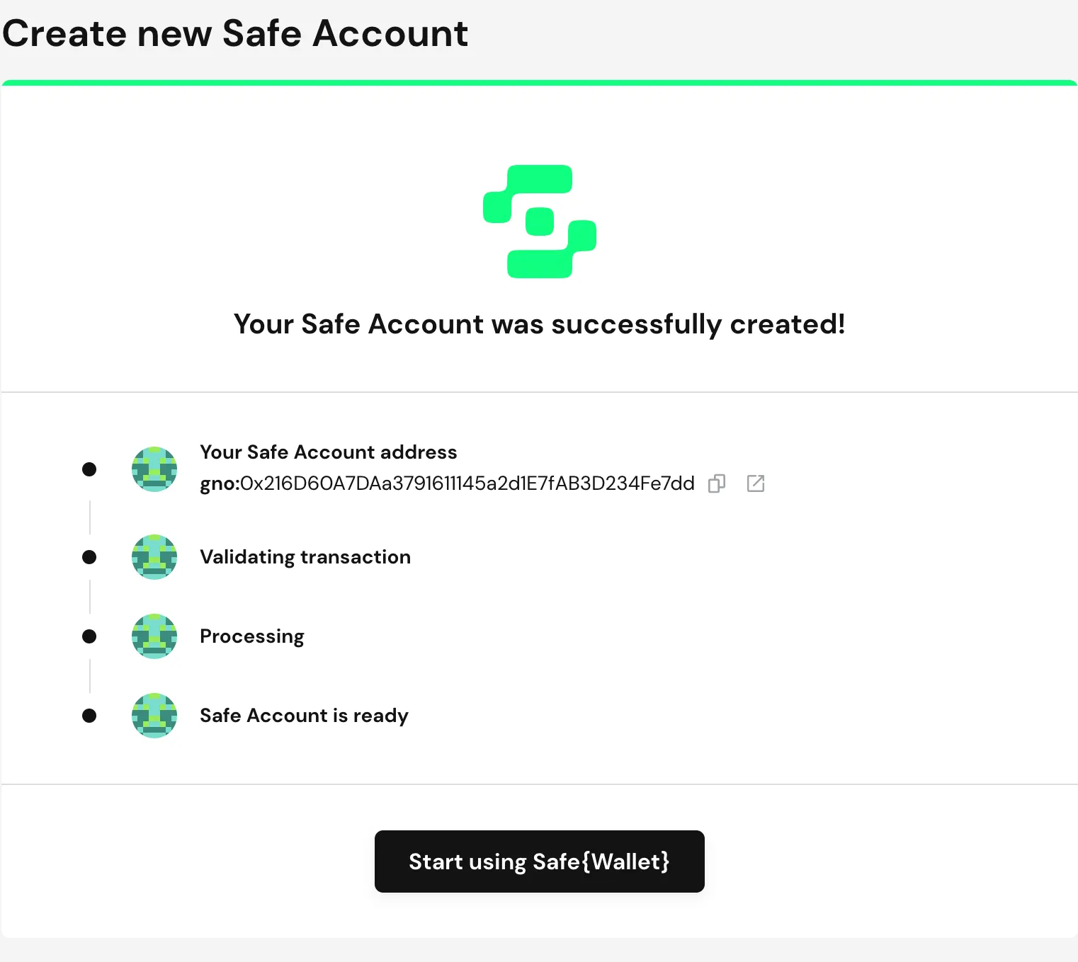 Safe가 지갑을 생성하는 데 필요한 시간을 허용합니다. 이 단계는 몇 분 동안 걸릴 수 있습니다. 클릭 가능하면 [Safe 사용 시작]을 선택합니다 .