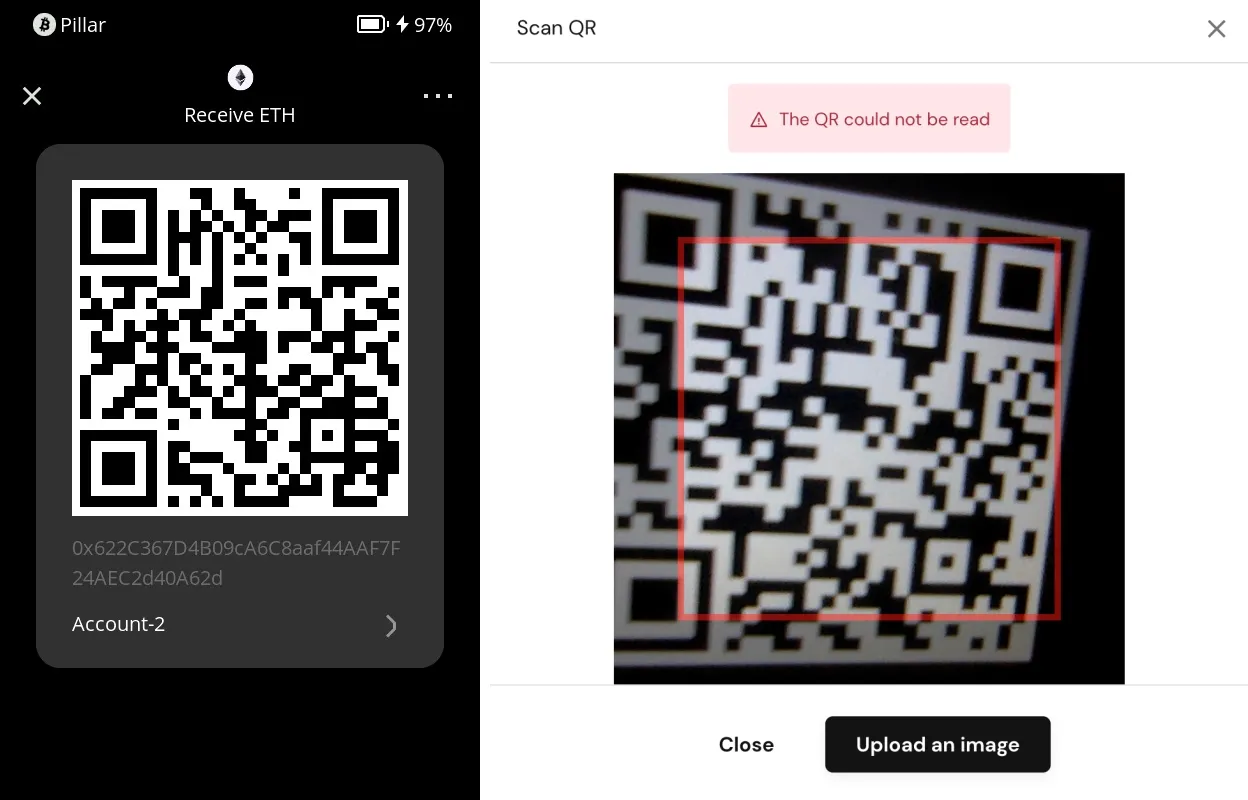 안전한 웹 지갑에서 컴퓨터 카메라를 사용하여 선택한 주소의 QR 코드를 스캔합니다. 이렇게 하면 주소가 성공적으로 추가됩니다.