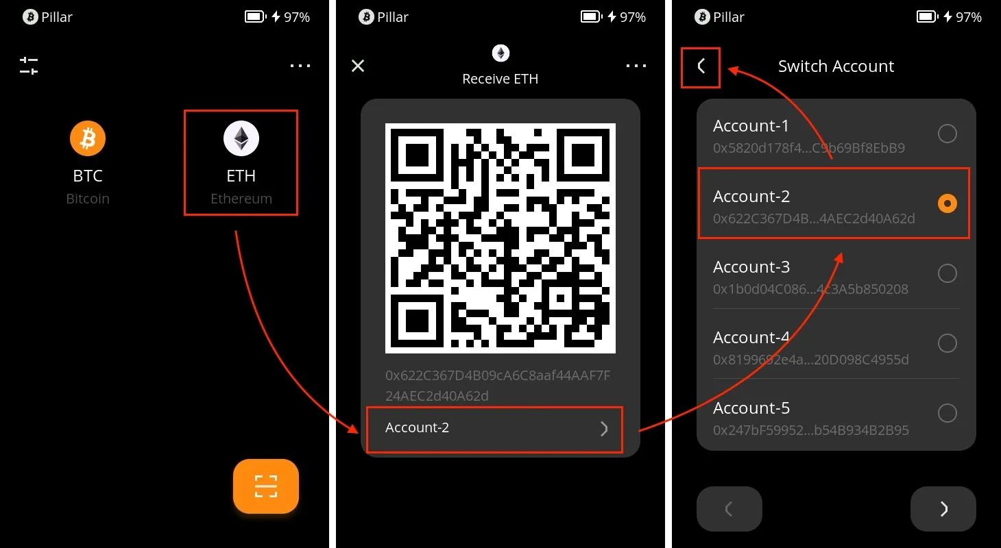Keystone 지갑을 시작하고 홈페이지에서 [ETH] 로 이동한 다음 주소를 선택합니다. 중복을 방지하기 위해 Keystone을 OKX에 연결할 때 처음에 첫 번째 계정을 선택했기 때문에 대체 계정을 선택합니다.