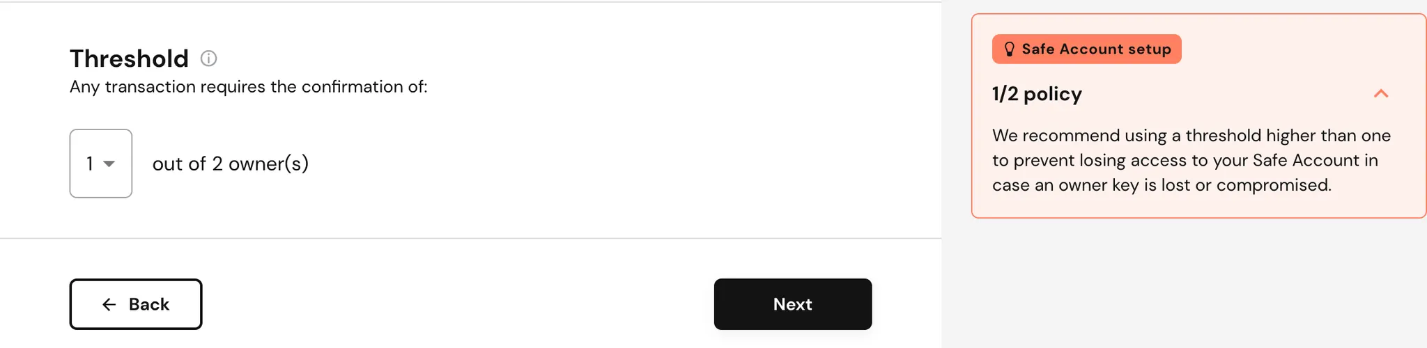 아래로 스크롤하여 임계값 번호를 설정하고 [다음] 을 클릭하여 진행합니다 . 예를 들어, 내 구성과 유사한 1-2 다중 서명 지갑을 구성한 경우 이 지갑 내에서 거래를 시작하려면 거래를 성공적으로 브로드캐스트하기 위해 소유자 한 명의 서명만 필요합니다. 반면, 2-2로 설정한 경우 성공적인 거래 브로드캐스트를 위해 두 소유자의 서명이 모두 필요합니다.