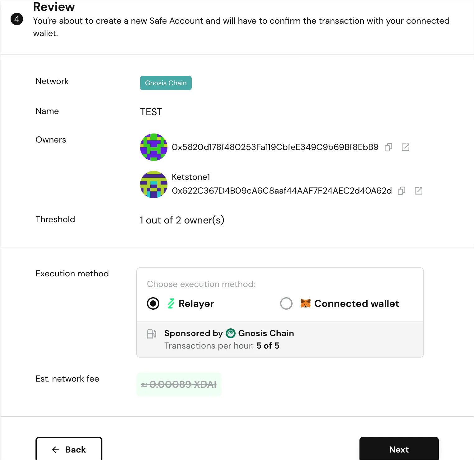 다중 서명 지갑의 세부 사항을 주의 깊게 검토하십시오. 지갑 수수료 생성을 위한 선호하는 지불 방법을 지정하십시오. [다음]을 클릭하여 이 단계를 마무리하십시오 .