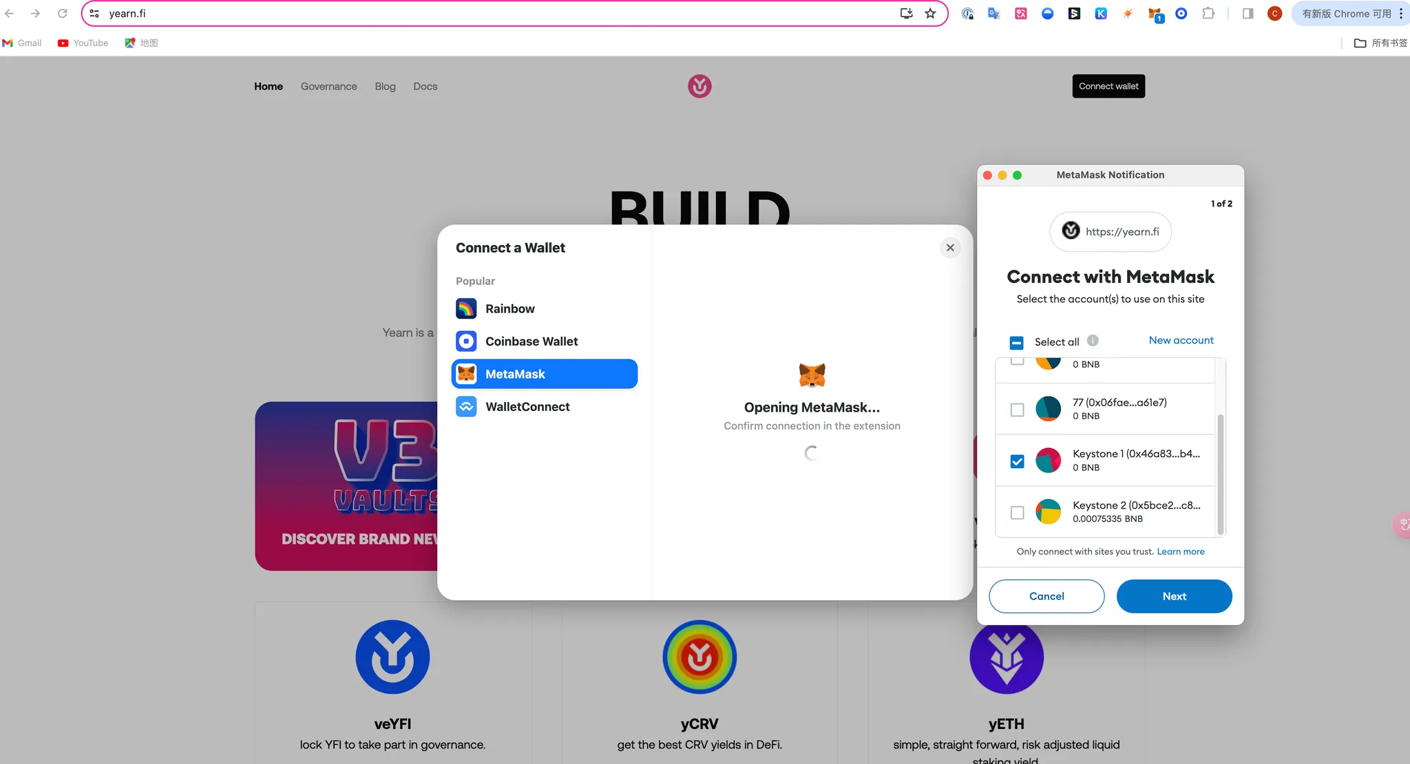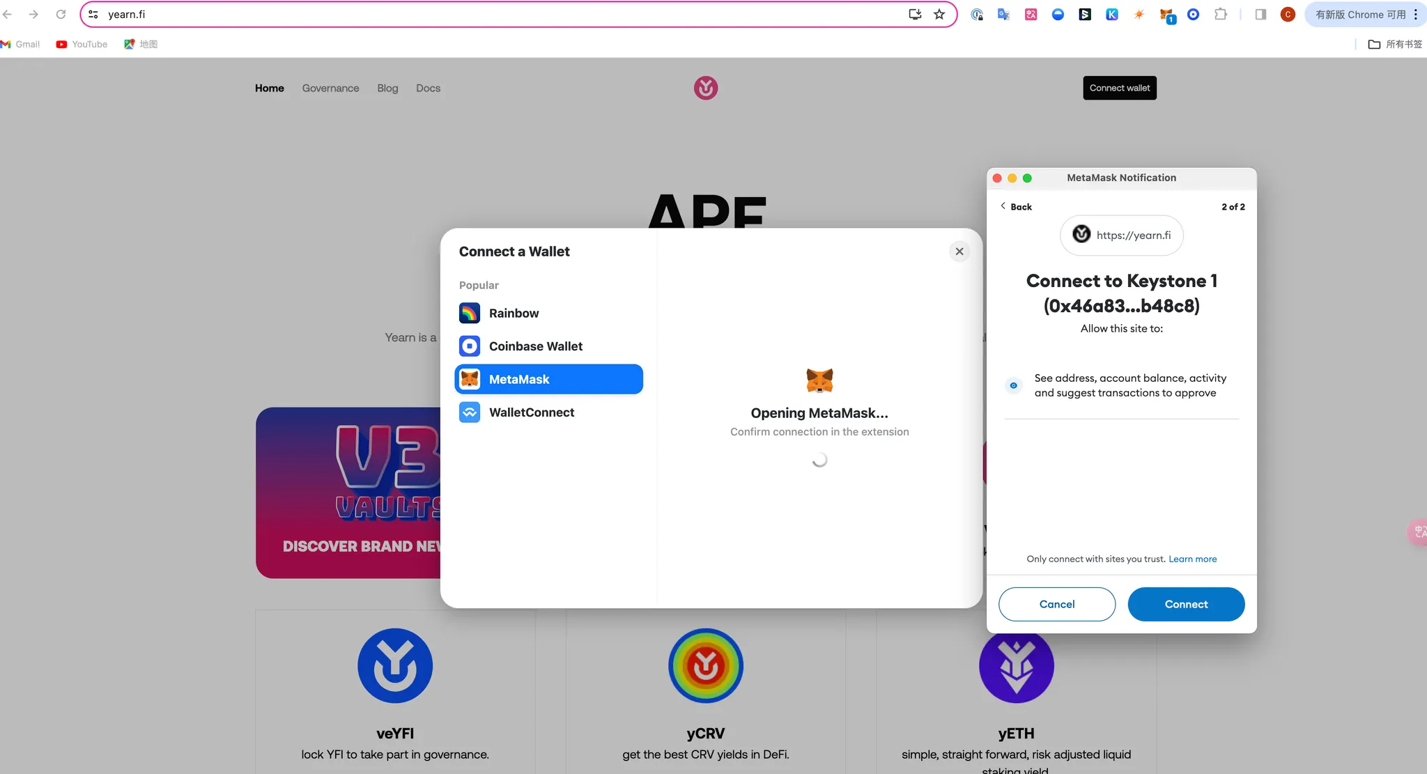 이 튜토리얼에서는 Keystone을 MetaMask에 연결한 후 Yearn Finance와 상호 작용하는 방법을 소개합니다.