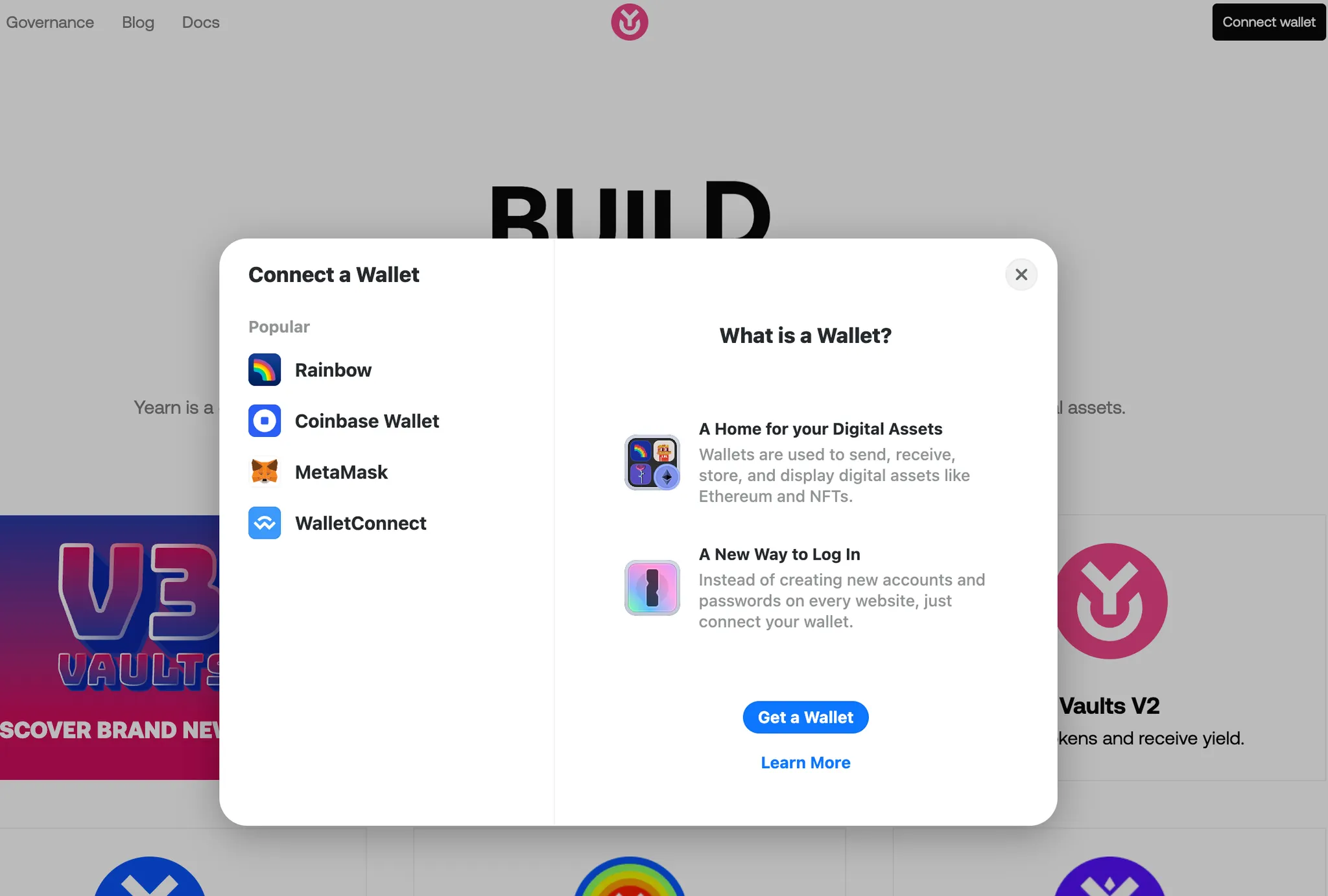 Yearn Finance 웹사이트에서 "Connect Wallet"을 찾아 클릭하세요.